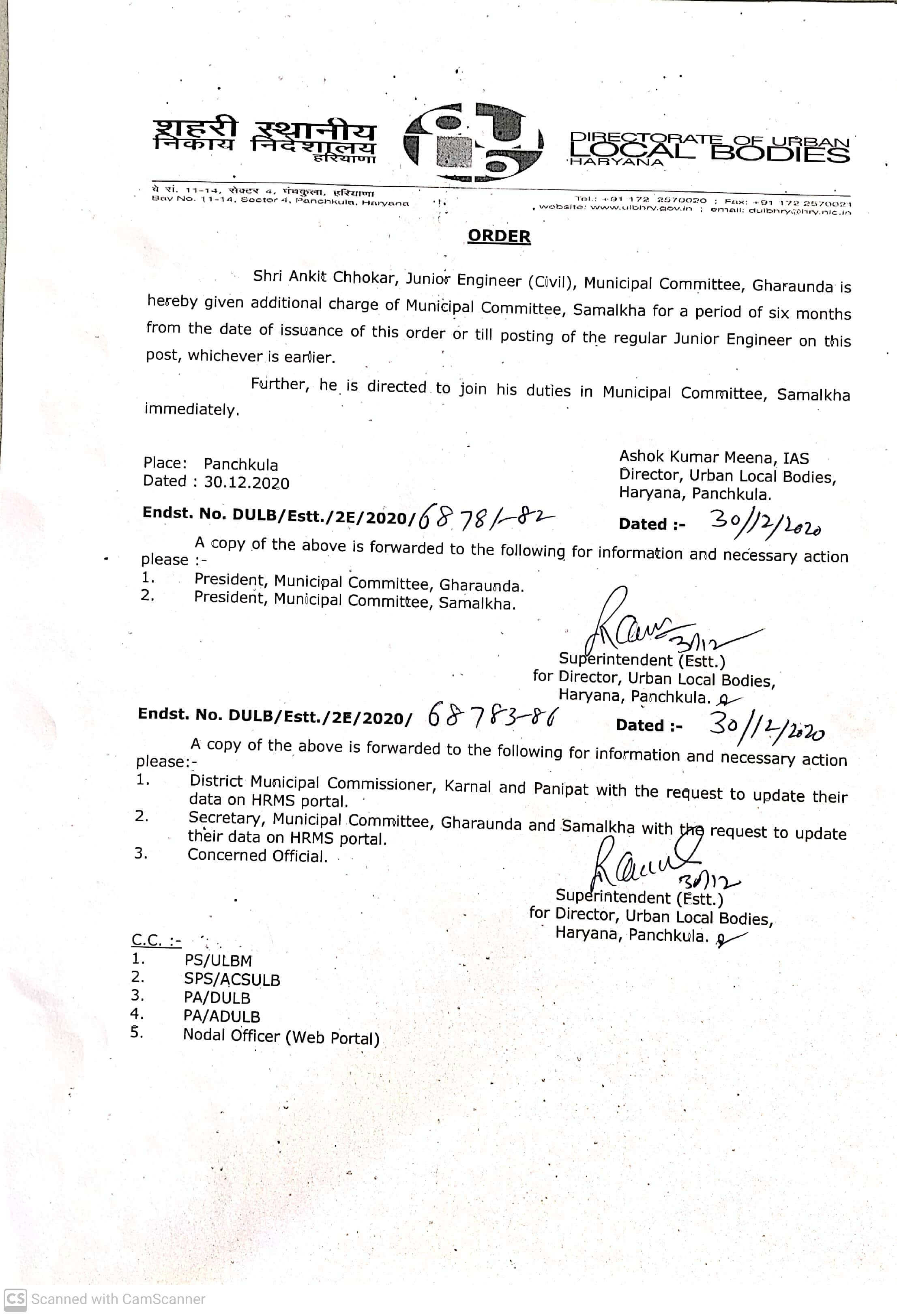 | 71 | Transfer order of Shri Ankit Chhokar, JE Municipal Committee Samalkha | View | 316 KB/IMAGE | 30-12-2021 |