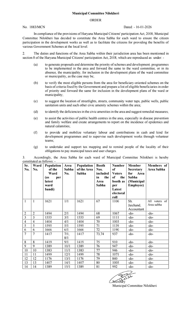 Nilokheri is a Modern town having population of 17938 as per census 2011 now comes to the tune of 22000 app. It is located in district Karnal at a distance of 19 kms in North of Karnal and 15 kms in south of Kurukshetra at National Highway No.1. In this town, Municipal Committee was constituted in 1961. The town has been divided in 13 wards, out of which three wards have been reserved for S.C.(two for male and for female) one wards for B.C.and nine wards are general. The area of Nilokheri Municipal Committee is app 5.6 sq. Km.